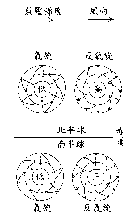 名詞解釋: 在高壓系統中心,空氣是由系統中心向外吹送,因為受到地球自轉偏向力(即柯氏力)的影響,其氣流運動方向在北半球會向右偏,在南半球則向左偏,因而造成北半球的高壓中心氣流呈順時針方向流動,南半球則呈反時針方向流動。這種向外輻散的螺旋形氣流因為與氣旋方向相反,故稱為反氣旋。 在反氣旋中,因為空氣向外流出,因而會造成中心的空氣下沈。空氣下沈係按乾絕熱過程增溫,因此不會產生凝結作用,所以反氣旋或高壓中心通當都伴隨著晴朗的天氣。 |