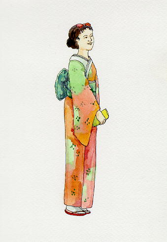 日本的傳統服裝。長衣、前身疊合,且腰間繫以寬帶。 |