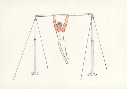 一種體操器械。由圓柱形鋼鐵製成,兩端固定於直柱上端的運動用具。長二百四十公分,半徑二點八公分。運動者手握鐵槓,引身上升或旋轉,藉以鍛鍊臂力。 |