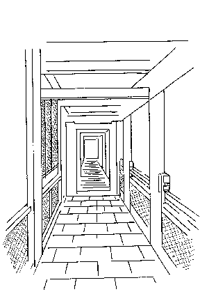 [名] 屋前簷下通行的走道。如:「走廊」、「長廊」。 |