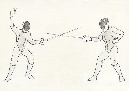 1.以劍相擊刺之術。《史記.卷一一七.司馬相如傳》:「少時好讀書,學擊劍。」 2.一種劍術競技活動。比賽時選手穿著金屬製成的服裝,頭戴網狀金屬面罩,用劍互刺互劈。以擊中對方身上的有效部位次數多寡定勝負。 |
