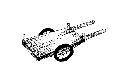 兩邊各有一個橡皮輪子的車。車身為笨重的大木板,四周無柵欄,多以人力拉行。 |
