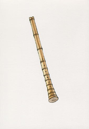 樂器名,吹管樂器:(1)竹製,直吹。正面五孔,背面一孔。為獨奏樂器,亦常用於傳統絲竹樂合奏或古琴合奏中。(2)特指海南島黎族的吹奏樂器。以一根無節長竹管製成,有二吹孔,四個按音孔,前三後一,音色深沉且柔和,音量較小。 |