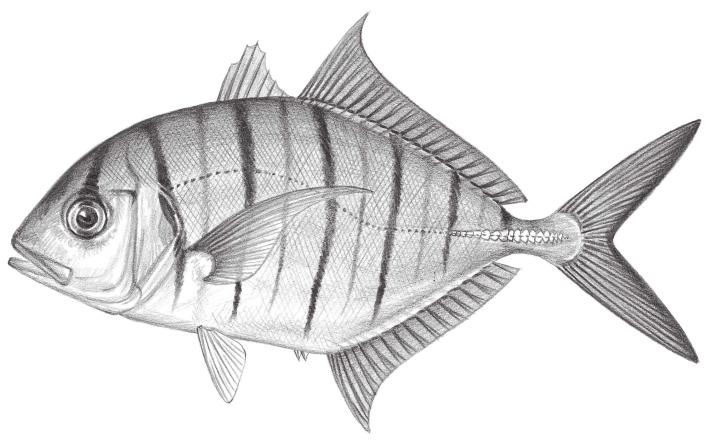 描述: 體呈橢圓形,側扁而高。眼小。脂性眼瞼不發達。上頜骨末端僅達眼前緣下方。上頜、鋤骨、腭骨及舌面皆無齒,下頜亦僅於幼魚時有數枚微小的細齒,成魚則消失。體被小圓鱗,胸部完全具鱗。側線直走部始於第二背鰭第8-9鰭條之下方。稜鱗弱,只存在直走部的後半部。第二背鰭與臀鰭同形,前方鰭條呈新月形,後方不具有離鰭;體色銀白至黃色,體側有7-11條寬窄相間的黑色橫帶,第一條橫帶貫穿眼部,第二條則橫越鰓蓋後緣。鰓蓋後緣的上方另具一黑斑。各鰭皆為黃色,尾鰭另具黑色緣。大型魚之體側另散佈黑點。 |