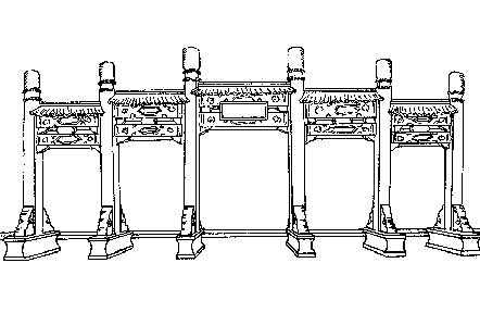 作為裝飾用的建築物,兩立柱之間施額榜,柱上安裝斗拱形簷屋,下可通行的紀念性建築物。多建築在市街要衝或名勝古蹟之處。《初刻拍案驚奇》卷七:「露下沾衣,寒氣逼人,面前有座玲瓏四柱牌樓,抬頭看時,上面有個大匾額,乃是六個大金字。」《儒林外史》第一四回:「馬二先生獨自一個,帶了幾個錢,步出錢塘門,在茶亭裡喫了幾碗茶,到西湖沿上牌樓跟前坐下。」 |