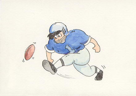 名詞解釋: 美式足球是風行於北美洲,類似於橄欖球的球類運動。比賽時間共六十分鐘,分四節,每節十五分鐘。每節結束換邊,休息兩分鐘,每半場時,休息十五分鐘。如果六十分鐘賽完,分數相等時,大學比賽判為和局,但是職業賽則必須加賽十五分鐘內,先得分者獲勝。如打完加賽的十五分鐘,雙方得分仍相等,則算和局。 進攻球員包括:中鋒(center)、前衛(offensive tackles)、邊鋒(tight ends)、外場接球員(wide receivers)、四分衛(quarterback)及全衛(fullback)。 防守球員包括:防守中衛(defensive tackles)、半衛或跑衛(halfback or running back)、防守邊衛(defensive ends)及防守線衛(linebackers)、後衛(cornerbacks)、安全衛(safeties)。 球場長一百二十碼,寬五十三碼。其兩端十碼地區,即得分線(goal line)到端線(end line)中間的地區,叫得分區(end zone)。其餘一百碼,由中間五十碼處向兩邊每隔五碼畫一線,一直到得分線為止。 |