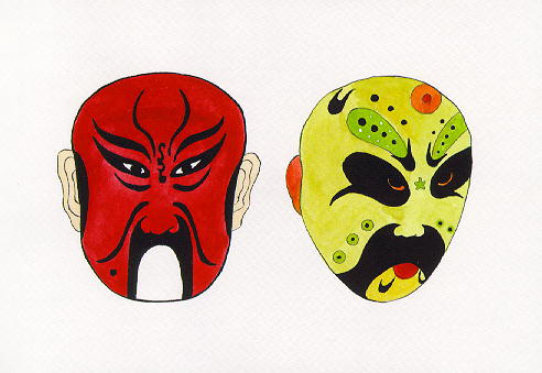 國劇淨、丑角色臉上所畫的各種條紋和圖案。各種人物大都有特定的譜式和色彩,借以突出人物的性格和特徵,顯示劇中人的忠、奸、善、惡。 |