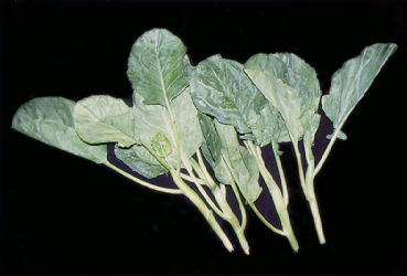 植物名。十字花科蕓薹屬,一年生草本。莖粗,直立,高二十至六十公分。基生葉卵形,莖生葉卵圓形至長橢圓形,邊緣波狀或具不整齊鋸齒,基部耳形,葉柄長,秋天變為紫色。總狀花序,花白色或淡黃色。是一種不結球的甘藍。嫩葉供食用,富鈣、磷及鐵質。 |