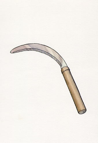 收割農作物和割除雜草的工具。形狀彎曲如鉤。 |
