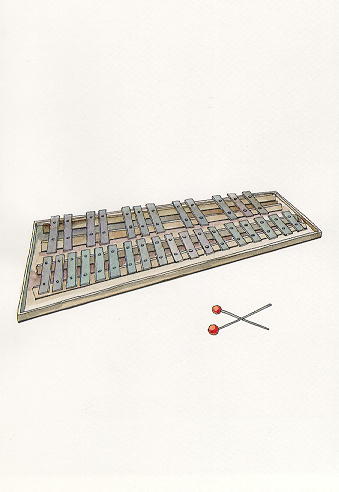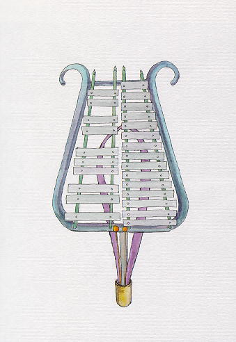 樂器名:(1)打擊樂器。將鐵製音板按鋼琴鍵盤的序列排列在板架上,每個音板下裝有閉口的共鳴管。演奏時,使用木製的撥子敲打,使發聲音。為英語Metallophone的意譯。音質近於鋼片琴,卻又較鋼片琴響亮有力。(2)藏族的一種拉弦樂器,形制近於二胡,全長約七十五公分。 |