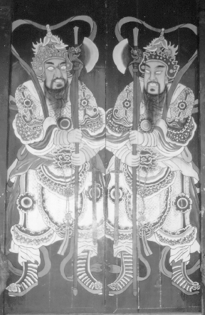 名詞解釋: 門神為神名。道教和民間信仰的守衛門戶之神。舊俗源於古代「五祀」之一的「門祀」。「門神」一詞始見於〔禮記、喪大記〕鄭玄注:「君釋菜以禮禮門神。」〔通俗篇.鬼神〕引〔禮〕:「今謂其左曰門丞,右曰戶尉。泛言門戶之神。」〔漢書、禮儀志〕:「東海有度朔山,上有二神人,一曰神荼,一曰鬱壘,主閱領眾鬼之惡,有害人者,執以葦索結之,而以飼虎。」〔荊楚歲時記〕:「正月一日繪二神貼戶左右,左神荼,右鬱壘以御凶邪,俗謂之門神。」(〔類說〕卷6引)又〔風俗通〕:「上古之時,有神荼與鬱壘昆弟二人,性能執鬼。」故古時民間習俗皆以神荼、鬱壘為門神,以御鬼也。至唐代以後,更有以秦叔寶、尉遲敬德(尉遲忝)為門神者。〔三教搜神大全〕:「戶神唐秦叔寶、尉遲敬德二將軍也。」按傳云:「唐太宗不豫,夜聞寢門外鬼魅呼號,太宗以告群臣,秦叔寶奏云:『願同尉遲敬德戎裝立門外以伺。』太宗可其奏,夜果無事。因命畫工繪二人之像懸宮門,邪祟以息。後世以襲之,遂永為門神。」今之廟宇殿門,多繪一白臉一黑臉的二神像,即秦與尉遲二神,臺灣民間建廟即多沿此舊俗;而一般民家則於過年時,依例多貼紙像於門上以辟邪驅鬼,禳災迎福,成為年畫中的民藝版畫。 |